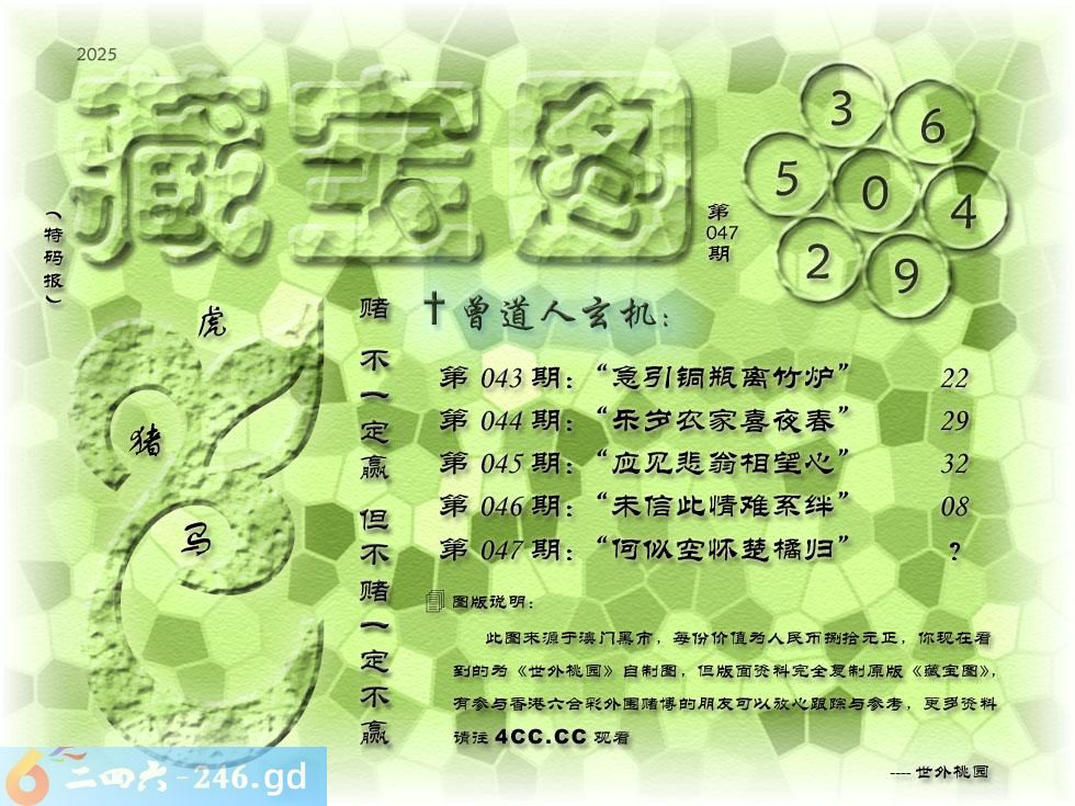 047期藏寶圖 新:何似空怀楚橘归 老:翠柳轻风春色流 禁:狗 禁:7尾 玄機字:《光》