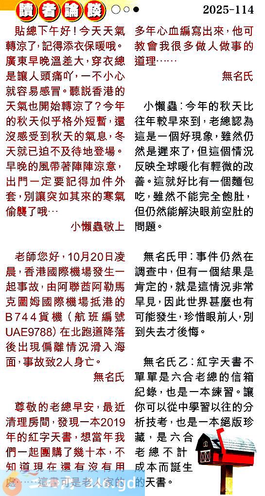 第一一四期讀者論談 1.貼總下午好!今天天氣轉涼了,記得添衣保暖哦。廣東早晚溫差大,穿衣總是讓人頭痛吖,一不小心就容易感冒。聽說香港的天氣也開始轉涼了?今年的秋天似乎格外短暫,還沒感受到秋天的氣息,冬天就已迫不及待地登場。早晚的風帶著陣陣凉意,出門一定要記得加件外套,別讓突如其來的寒氣偷襲了哦...小懶蟲敬上 〖小懶蟲〗:今年的秋天比往年較早來到,老總認為這是一個好現象,雖然仍然是遲來了,但這個情況反映全球暖化有輕微的改善。這就好比有一個題包吃,雖然不能完全飽肚,但仍然能解決眼前空肚的問題。 2.老師您好,10月20日凌晨,香港國際機場發生一起事故,由阿聯酋阿勒馬克圖姆國際機場抵港的744貨機(航班編號9788)在北跑道降落後出現偏離情況滑入海面,事故致2人身亡。無名氏 〖無名氏甲〗:事件仍然在調查中,但有一個結果是肯定的,就是這情況非常旱見,因此世界甚麼也有可能發生,珍惜眼前人,別到失去才後悔。 3.尊敬的老總早安,最近清理房間,發現一本2019年的紅字天書,想當年我們一起團購了幾十本,不知道現在還有沒有用處......這書可是老人家的多年心血編寫出來,他可教會我很多做人做事的道理.......無名氏 〖無名氏乙〗:紅字天書不單單是六合老總的信箱紀錄,也是一本練習。讓你可以從中學習以往的分析技考,也是一本絕版珍藏,是六合老總不計成本而誕生的天書。