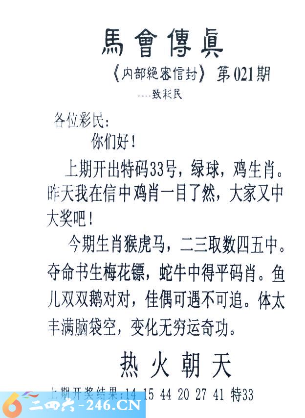 021期:首发推荐:≮馬會傳眞≯→(香港正版)