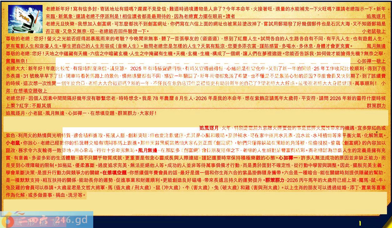 【1】.老總新年好!寫有信多封,寄送地址有錯嗎?遲遲不見登信,難道時過境遷物是人非了?今年本命年,火接著旺,適量的水能補充一下火旺嗎?還請老總指示一下。新年來臨,新氣象還請老總不停派利是!相信讀者都是最期待的,因為老總實力擺在眼前。讀者追風逐月