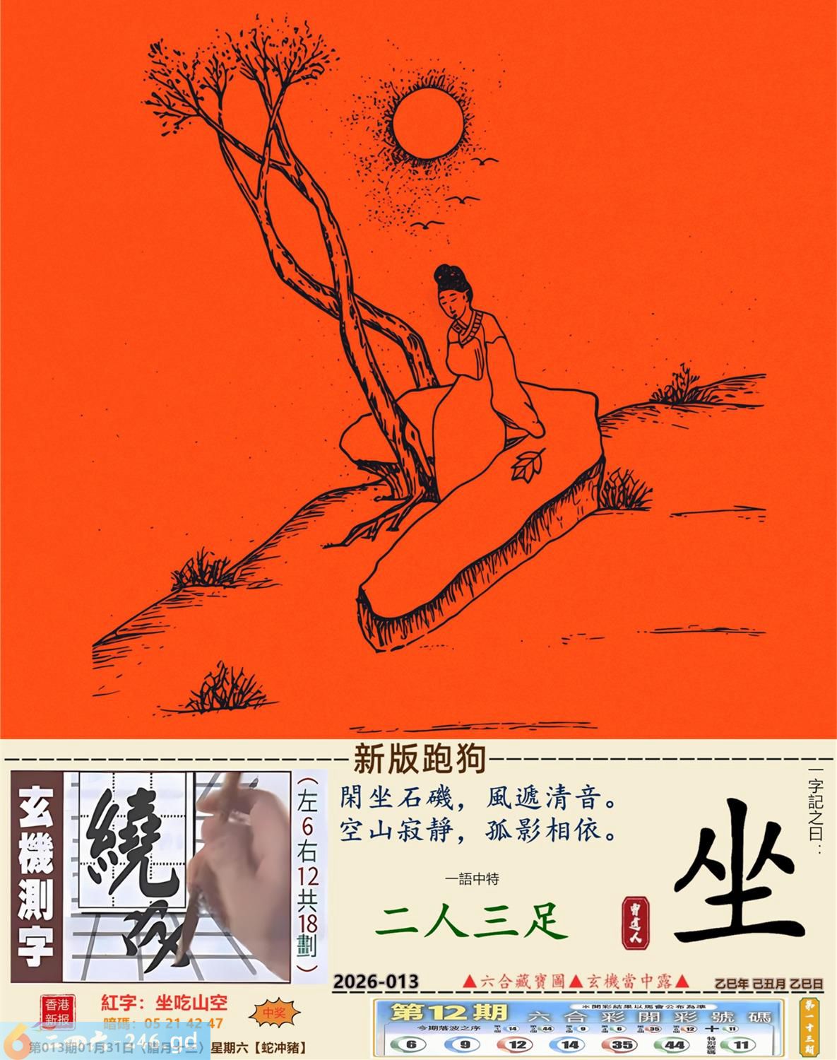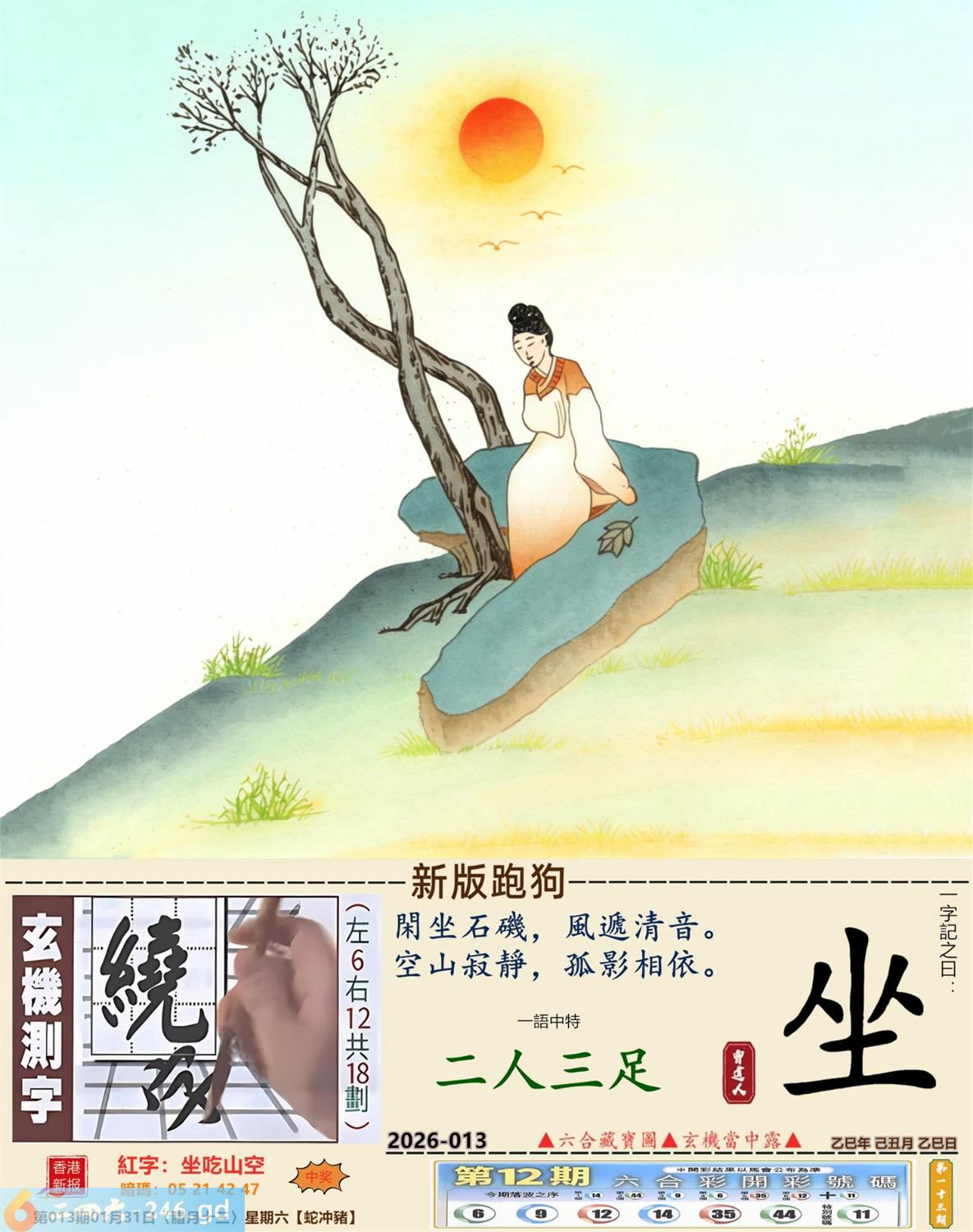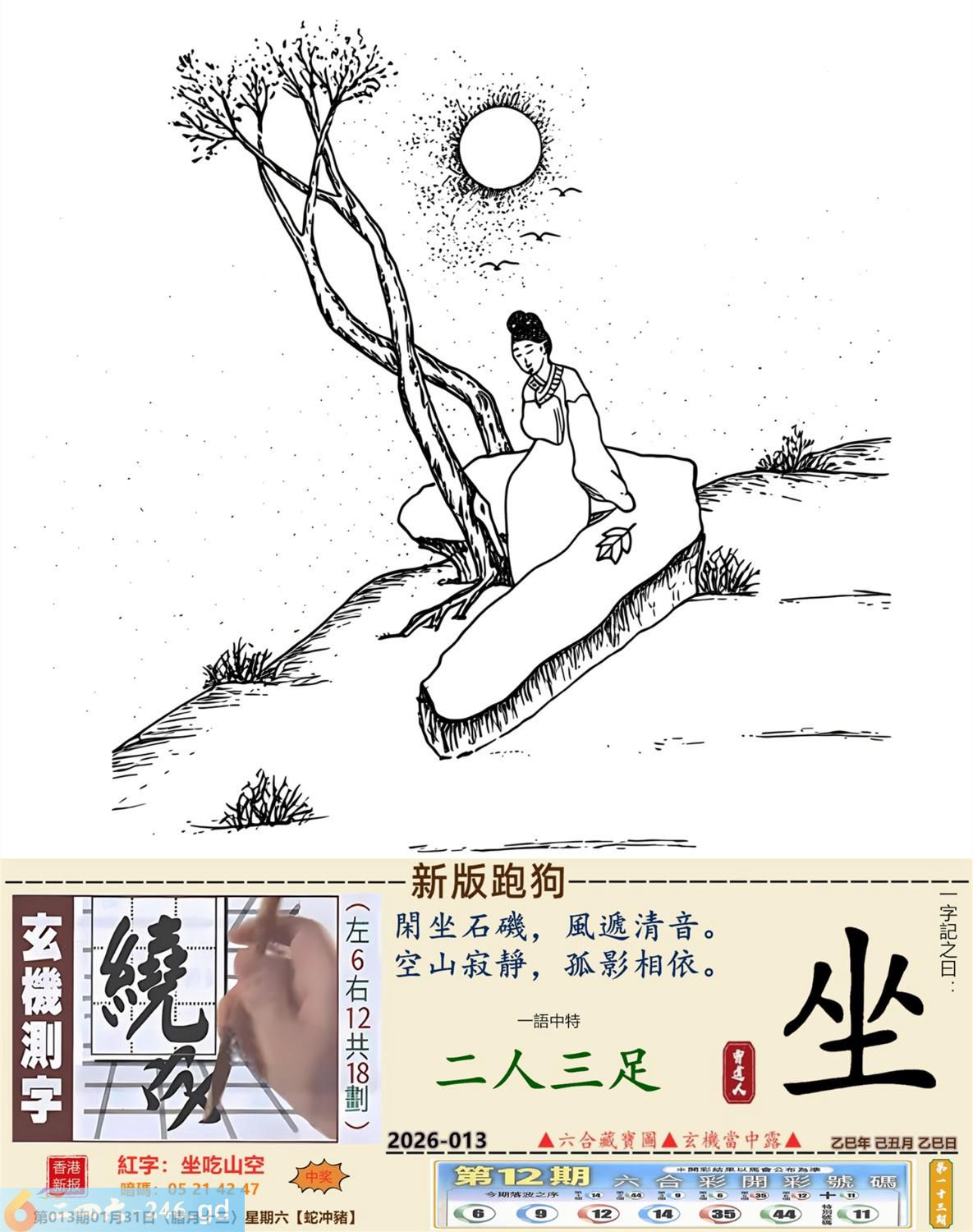 2026年1月31日013期(猪(己亥)(覆灯火) 013期:老版跑狗玄機一字記之曰:【錯】 詩云:坐食山崩錯難返他日折墮徒悲嘆 自恃有財,不事生產,放棄工作貪清閒; 坐食山崩,恨錯難返,他日折墮徒悲嘆。 玄機測字:《鋅》 密圖詩:英雄難過美人關 《記》:一個早上跑五圈 特碼大小單雙句:四鄉八里先后 今期必中:大喬 013期:特碼歇后語 钻子遇到锉子-----死对头 013期正版四字梅花诗:酒绿灯红。 013期火车头:烧伤狗。诗:马死牛伤,一蛇延愿十里长。 013期香港第一手欲钱料:马? 013期曾道人说:“三楼” 013期另版四字梅花诗:三百六十。 013期香港第一手欲钱料:欲钱看狗是怎么跑的。 013期曾道人说:“为什么地球是在转的”? 013期:二字經:今期 013期:鸡蛋是特码 013期:智力金壤;甜言蜜语 013期:信箱紅字:【坐吃山空】 013期:【暗碼:05-21-42-47】 013期:一語中特:【二人三足】 發財玄機圖:防患未然斜目睨視圖中明龍蛇藍綠 013期:藏寳圖 新:遥知贼胆纵横破 老:锦树摧残胡蝶老 禁:鼠禁:0尾玄机字《虚》 2026年013期【生活幽默】版 〖小偷〗 一小偷偷了個錢包,不久後落網。 在派出所他看到受害者, 小偷:"大哥,你錢包裏明明衹有2000塊,你怎磨説被偷了5000塊?後果很嚴重的!" 受害者:"兄弟,幫哥個忙,上個月我多花了3000,没法给媳姆報賬,正好你把我錢包偷了,這不......" 小偷噗通跪地:"大哥,我媳婦比你媳婦狠多 了,如果她以爲我偷了5000塊,衹上交2000,她會把我弄死不可,大哥,都是男人,你發發慈悲吧!"