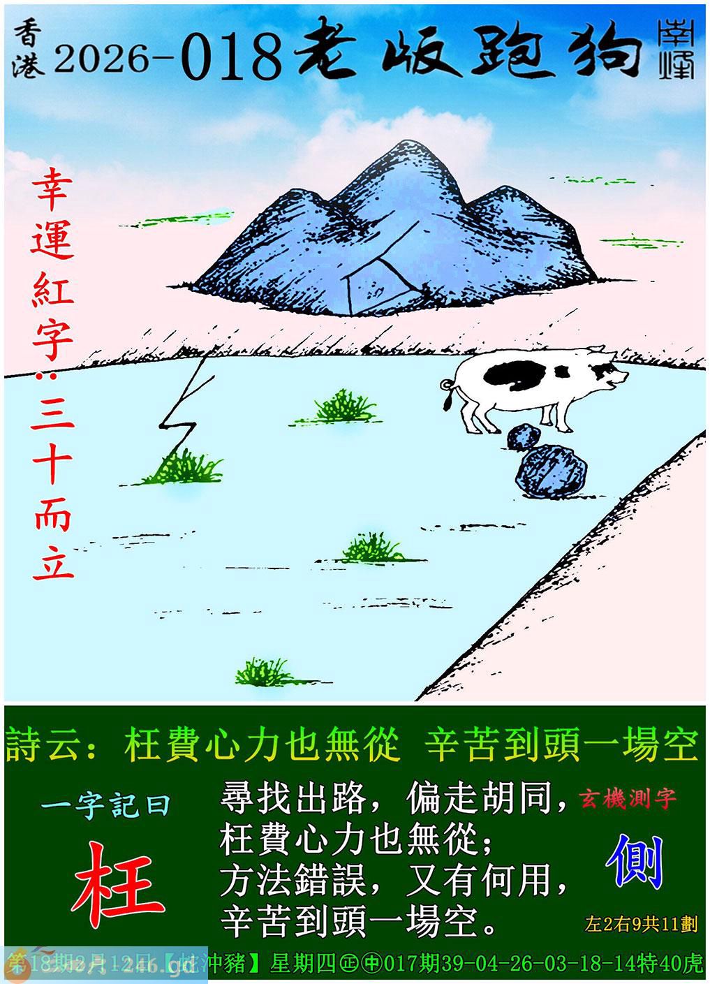 本帖最后由山丘于2026-2-1219:47编辑 018期老版跑狗一字记之曰:【枉】 诗云:枉费心力也无从,辛苦到头一场空。寻找出路,偏走胡同,枉费心力也无从; 方法错误,又有何用,辛苦到头一场空。 结合狗图,用一头猪来寻找出路,属实滑稽且不合理!首先方法错了,再怎么努力辛苦,到头来都是枉费心力一场空而已。一场空,要么什么都没有的零尾,要么竹篮打水的水肖了。 主:狗;防:猴鼠。