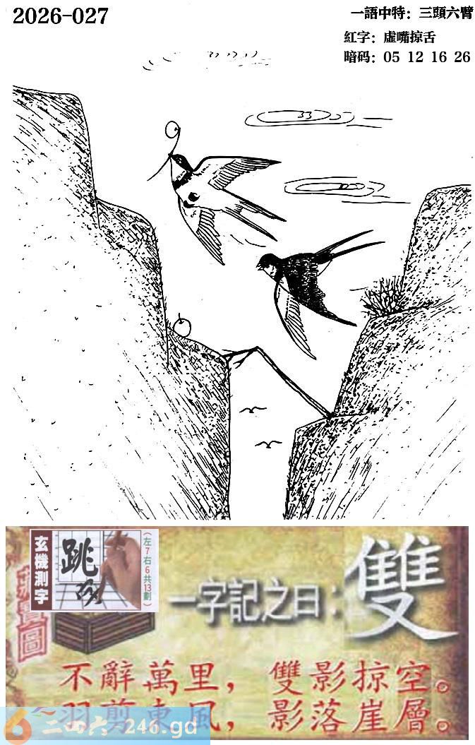 027期跑狗一字記之曰:【雙】 不辭萬裏,雙影掠空。 羽剪東風,影落崖層。 玄機測字:《跳》 一語中特:三頭六臂