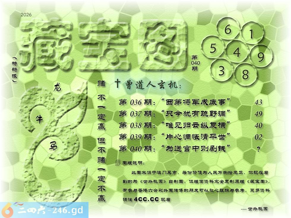 041期藏寶圖 新:为送宫中则剧钱 老:前度刘郎今又来 禁:狗禁:0尾玄機字:《奄》